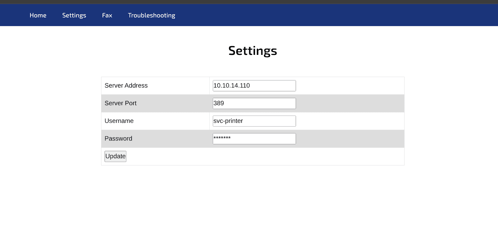 Upon clicking the "settings" link, a configuration option for an "LDAP server address" was observed. This presented a potential vulnerability for credential disclosure. The local hostname on the attacking machine was temporarily set to its tun0 interface IP address (10.10.14.110), and this IP was then input as the LDAP server address in the web application's settings.
